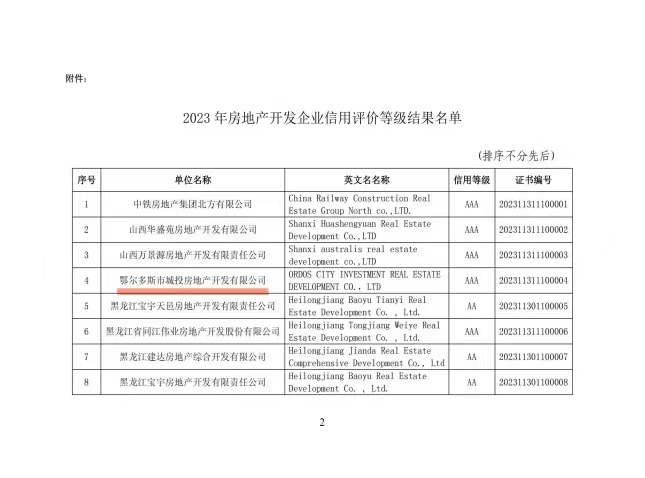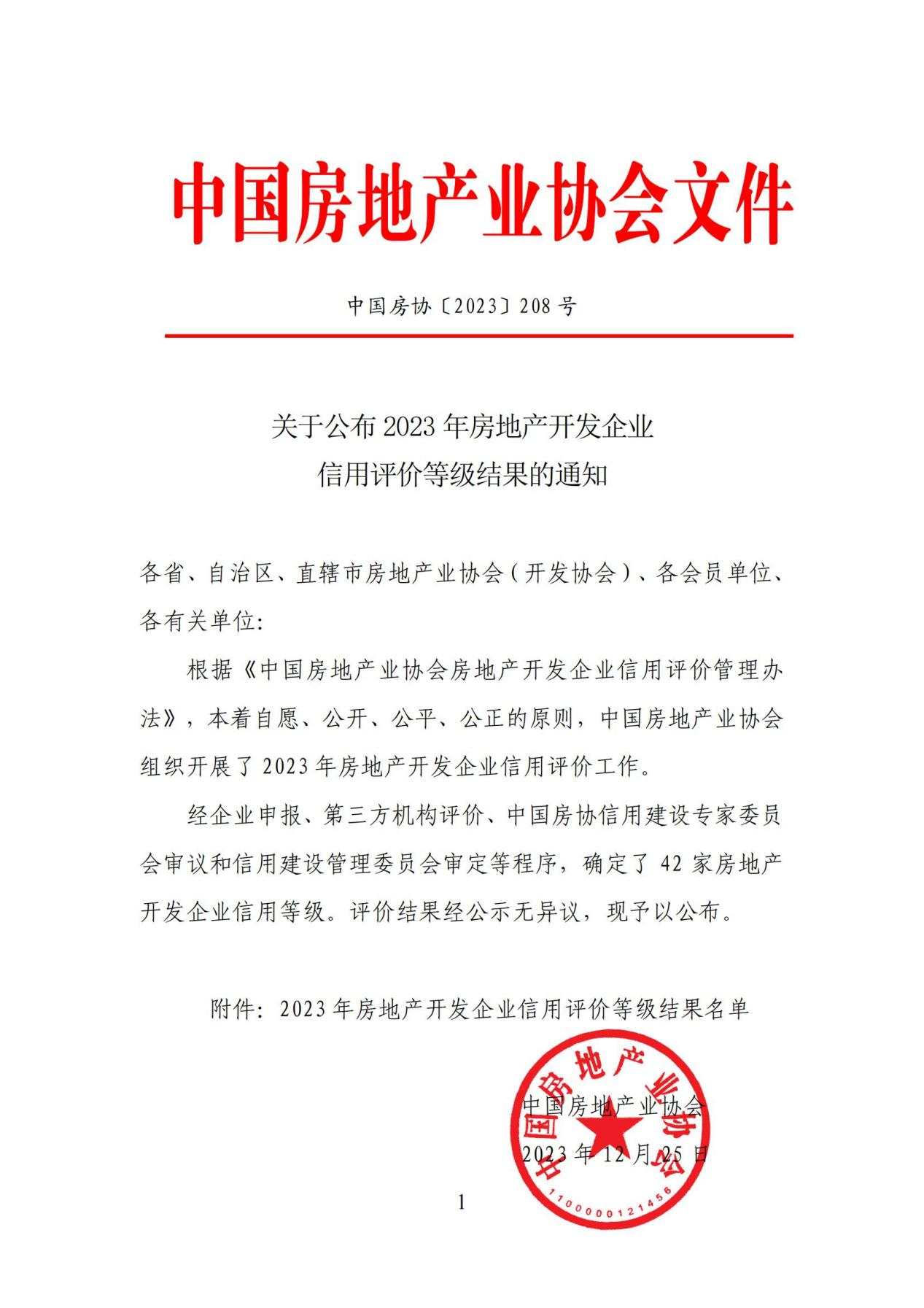 2023年年末,中國房地產(chǎn)協(xié)會(huì)公布了2023年房地產(chǎn)開發(fā)企業(yè)信用評(píng)價(jià)等級(jí)結(jié)果,市城投房地產(chǎn)公司贏得國家級(jí)“房地產(chǎn)開發(fā)企業(yè)信用評(píng)價(jià)企業(yè)”殊榮,AAA級(jí)為此次信用評(píng)價(jià)的最高等級(jí)。